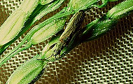 - 成虫の体長は5.5mm前後。体は細長く緑色をした小型種。イタリアンライグラスなどのイネ科植物の葉鞘内部で卵越冬する。モミ割れを起こした穂で多くなる。