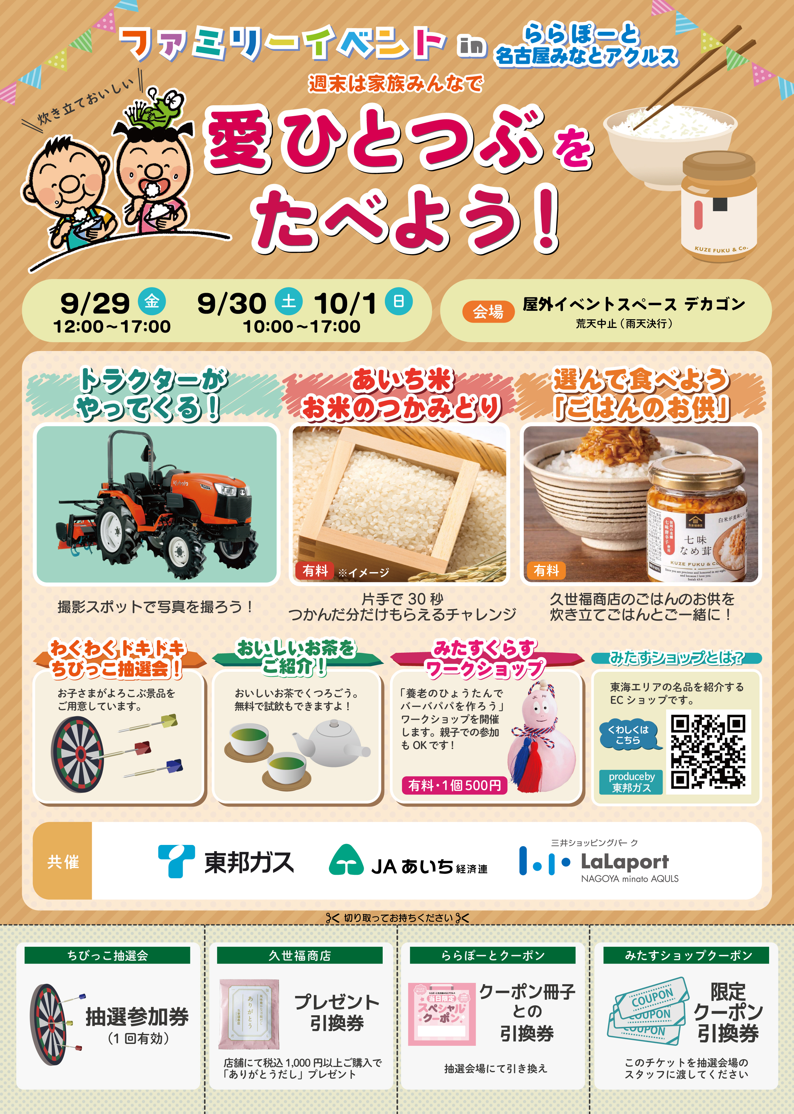 9/29(金)~10/1(日)、ららぽーと名古屋みなとアクルスで「みたすくらす&愛ひとつぶ ファミリーイベント」を開催します。